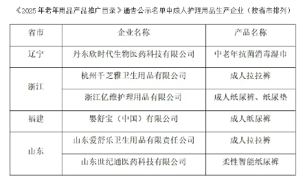 2025年10月29日,工信部正式公布了《2025年老年用品產品推廣目錄》,丹東欣時代、杭州千芝雅、浙江億維、福建嬰舒寶、山東愛舒樂、山東世紀通6家成人紙尿褲、護理墊、濕巾等產品生產企業入選名單。