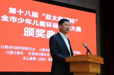 12月6日,第十八屆“亞太森博杯”全市少年兒童環保繪畫大賽頒獎典禮在日照經濟技術開發區連云港路小學舉行。市政協副主席惠旻出席并致辭,市僑聯黨組書記、主席宋強主持,市教育局黨組成員、副局長張穎宣讀獲獎名單,市生態環境局、日照日報社、共青團日照市委、市科協、日照經開區及公司有關負責人,獲獎學生、優秀輔導老師、優秀組織工作者、優秀組織單位代表及部分家長等800余人參加了活動。