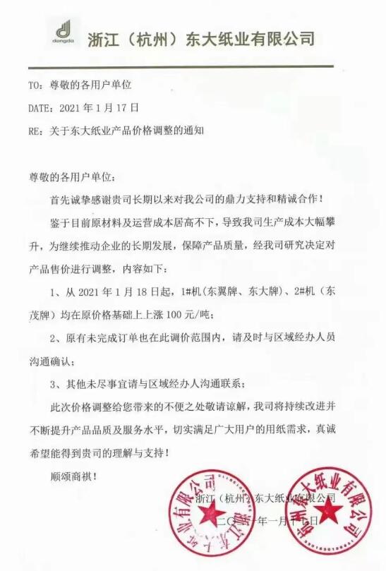 浙江東大紙業1號機、2號機價格上調(2021-01-19)