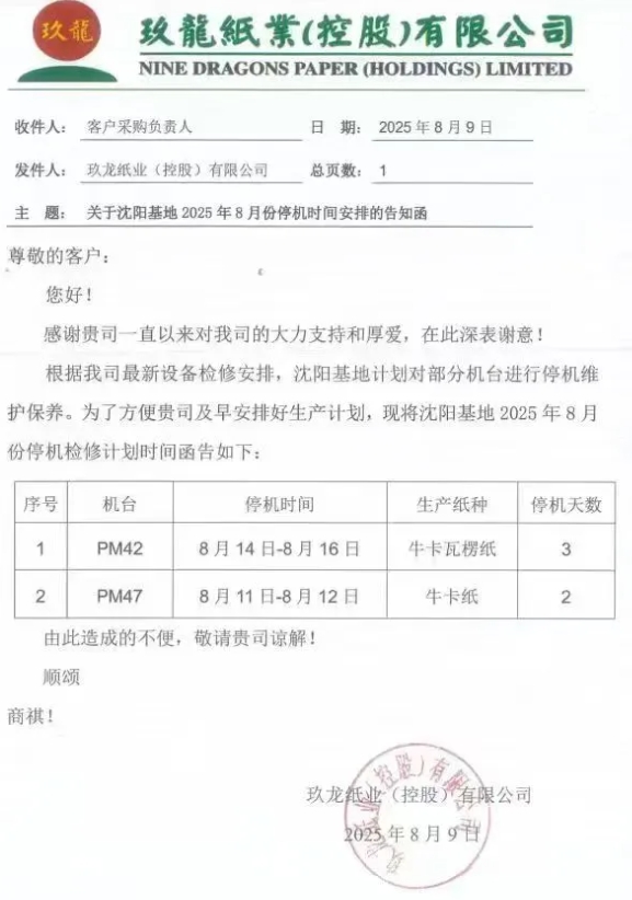 3、沈陽基地PM42紙機將在8月14日-8月16日期間停機檢修,PM47紙機將在8月11日-8月12日期間停機檢修,請下游客戶根據自身需求提前做好原紙備貨。