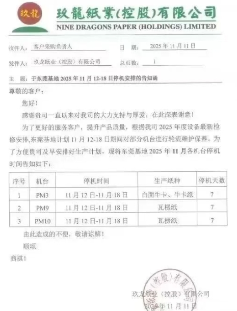 東莞玖龍發(fā)布11月停機函(2025-11-12)