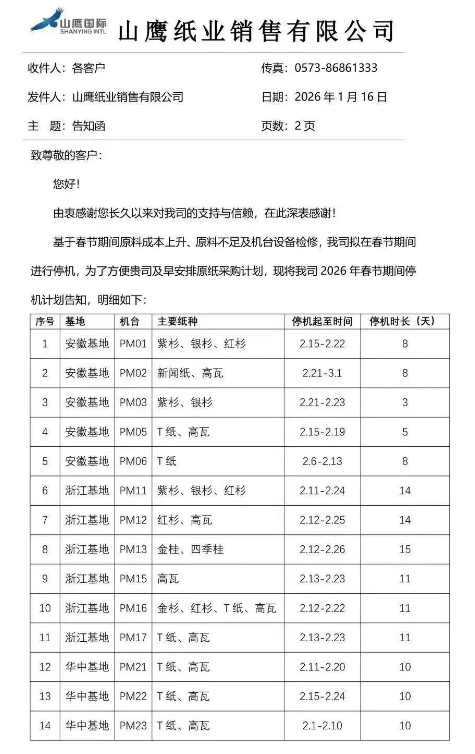 1月16日,山鷹國(guó)際發(fā)布新一輪停機(jī)檢修計(jì)劃,國(guó)內(nèi)7大基地全部機(jī)臺(tái)將在2月輪停3-28天,按照設(shè)計(jì)產(chǎn)能計(jì)算,預(yù)計(jì)減產(chǎn)約37萬(wàn)噸,其中絕大部分為箱板瓦楞紙。