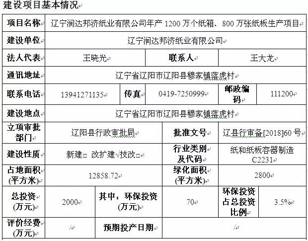 為滿足市場需要,擴大公司經(jīng)營范圍,遼寧潤達邦濟紙業(yè)有限公司(以下簡稱“建設單位”)擬投資2000萬元建設遼寧潤達邦濟紙業(yè)有限公司年產(chǎn)1200萬個紙箱、800萬張紙板生產(chǎn)項目(以下簡稱“本項目”)。