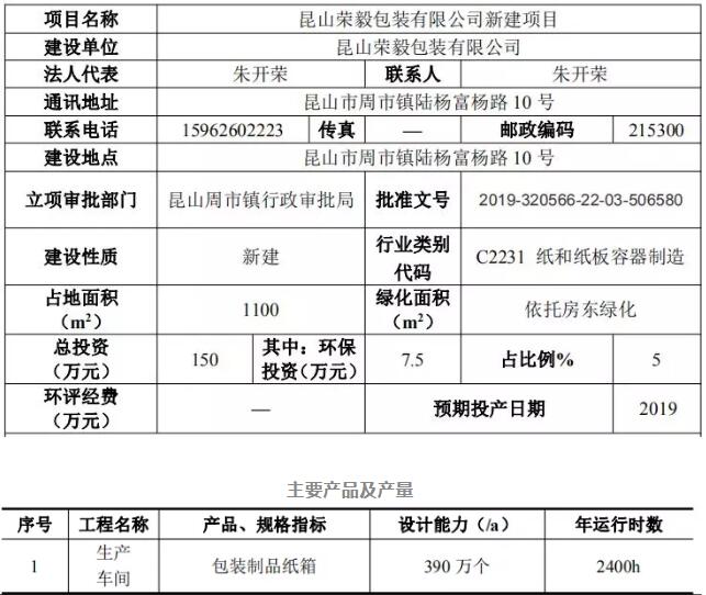 昆山市榮毅包裝有限公司擬投資 150 萬元于昆山市周市鎮陸楊富楊路 10 號租賃昆山市金玉針織服裝廠標準廠房從事生產,租賃面積為 1100㎡,經營范圍:紙箱、紙板、站板、護角、纏繞膜、PE 袋、吸塑盒、防靜電紙袋、珍珠棉、勞保用品、包裝材料的銷售;貨物的進出口業務;包裝制品的加工、銷售(依法須經批準的項目, 經相關部門批準后方可開展經營活動)。年生產包裝制品紙箱 390 萬個。