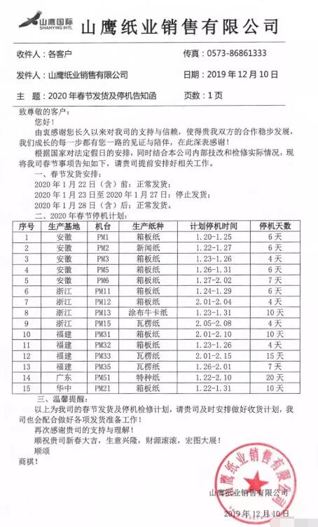 12月10日,山鷹紙業(yè)發(fā)布2020年春節(jié)停產(chǎn)檢修計劃,公司位于國內(nèi)五個生產(chǎn)基地的15臺紙機將在1月20日至2月15日期間輪停4-20天。
